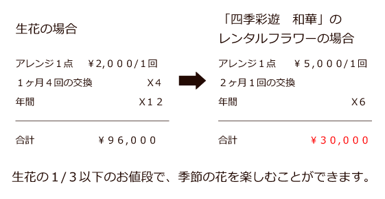 例えば、現在週1回花を入れ替えている場合でも、アーティフィシャルフラワーでは、1つを長く使うことができるため、月1回の交換とします。そのコストの変動は、、、